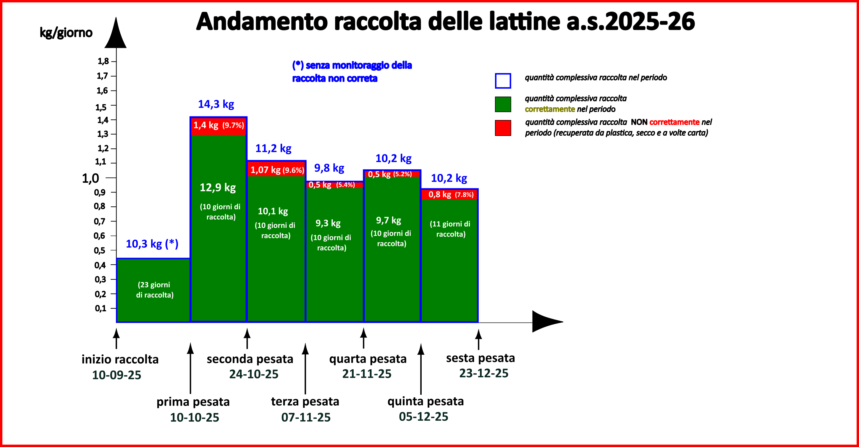 Nel grafico è possibile osservare l’andamento della raccolta delle lattine nel tempo con indicazione delle quantità medie giornaliere e la percentuale di lattine raccolte scorrettamente; quest’anno ci siamo dato come obiettivo la discesa sotto la soglia psicologica del 10% per quanto riguarda le lattine raccolte scorrettamente e l’avvicinamento delle stesse a quota 5%