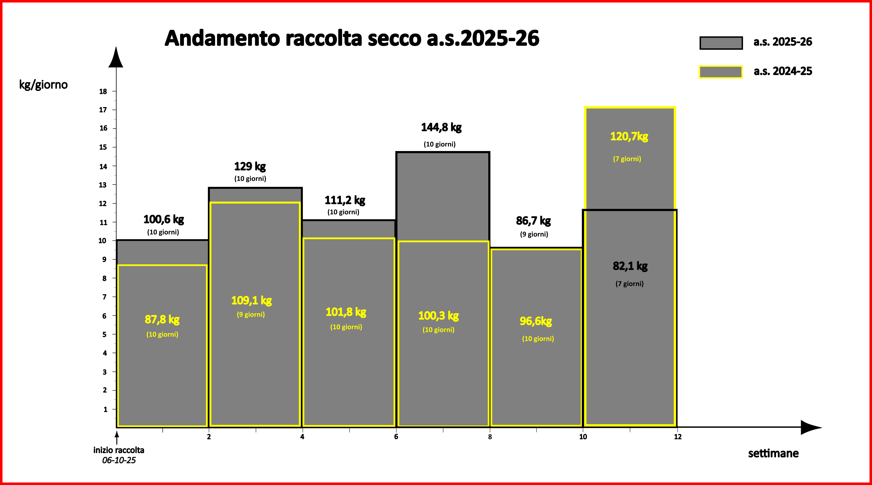 Nel grafico è possibile osservare l’andamento della raccolta del rifiuto secco nel tempo con le quantità medie giornaliere prodotte; confidiamo di riuscire nel corso dell’anno a metterci in una traiettoria discendente.