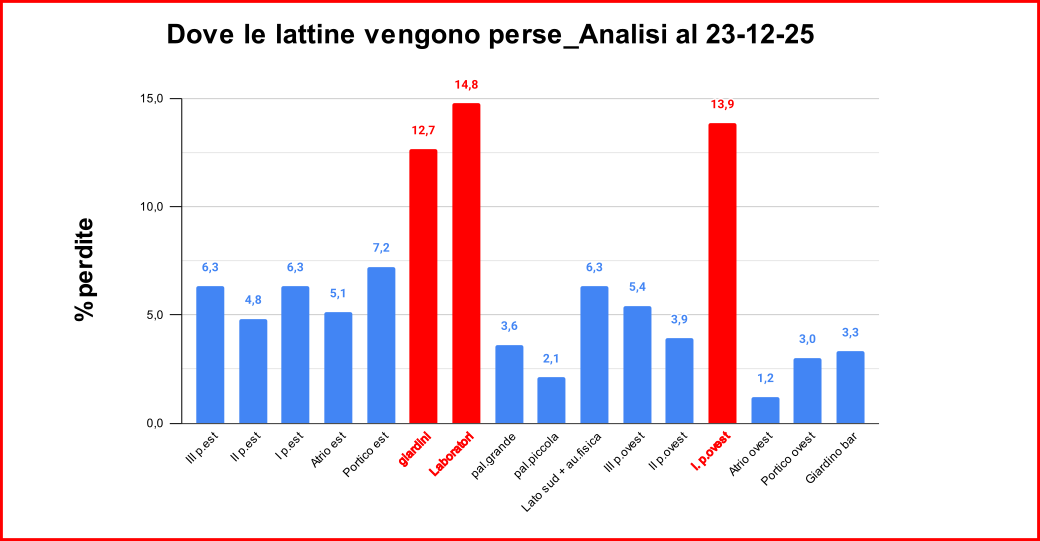 Il grafico mostra le percentuali delle lattine che si perdono nelle diverse zone della scuola per abbandono o per conferimento errato. I dati che hanno permesso la realizzazione del grafico ed il recupero delle lattine perse sono il frutto del lavoro di un Team di volontatri a cui va il ringraziamento di tutta la comunità scolastica