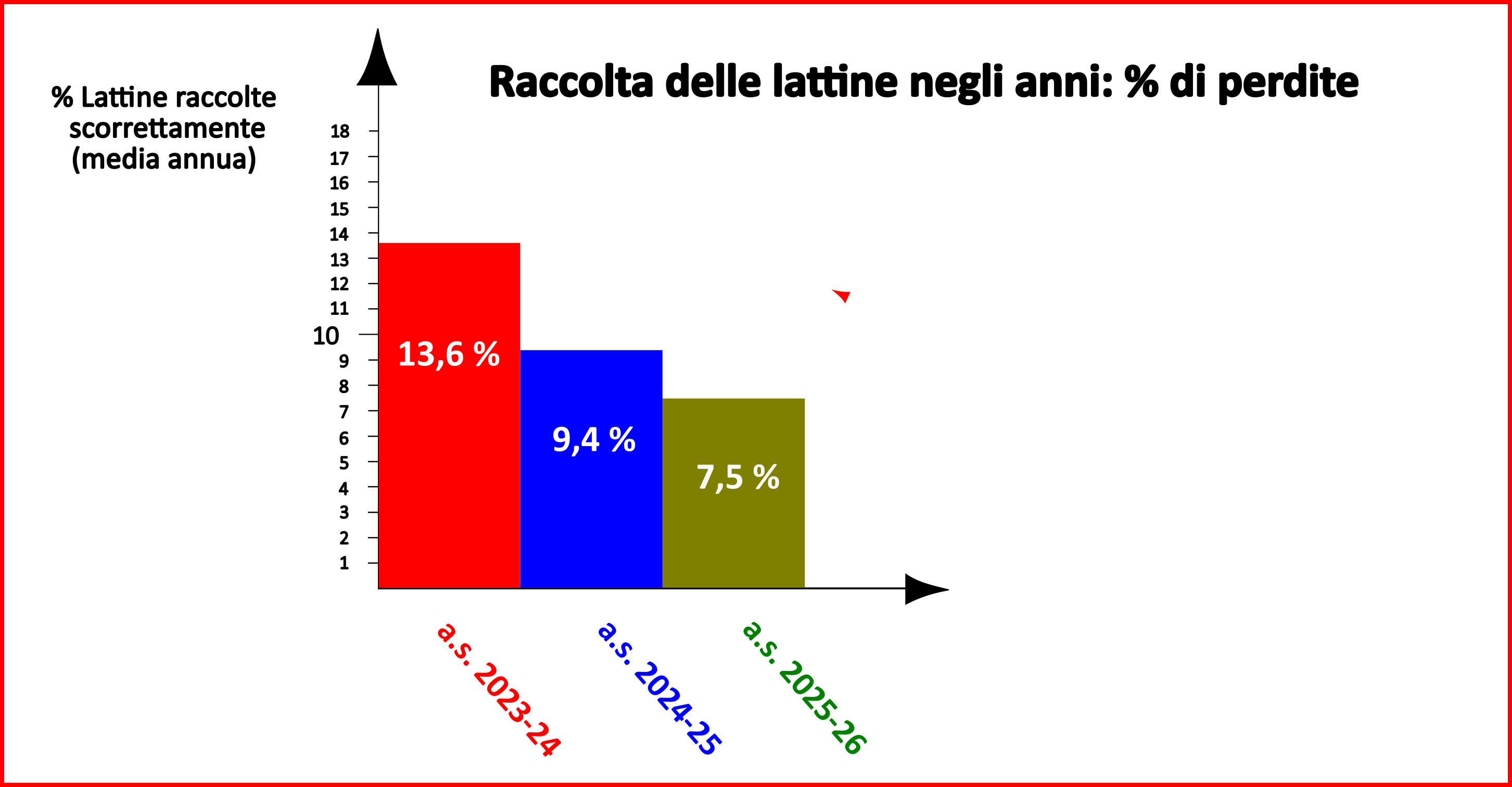 Nel grafico si può notare l'efficacia della raccolta separata delle lattine nei diversi anni scolastici; il nostro obiettivo finale è di restare sotto il 5% di lattine conferite scorrettamente